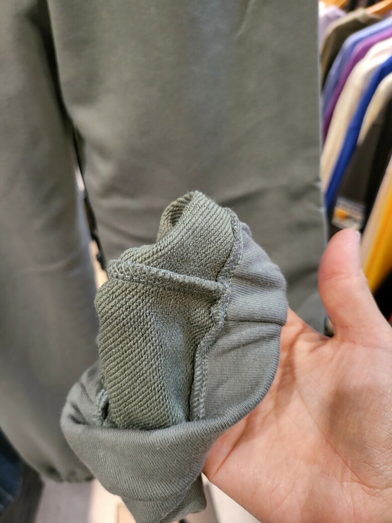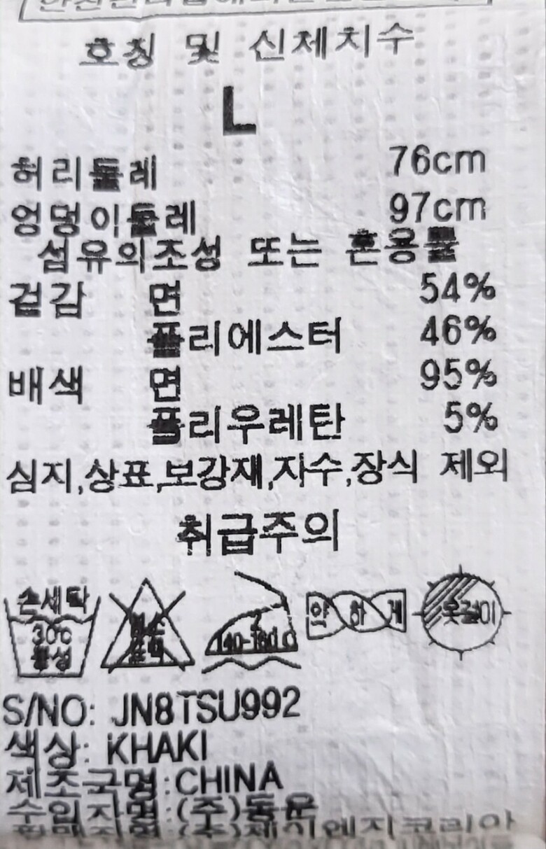 | 1. 제품 소재 (섬유의 조성 또는 혼용률을 백분율로 표시, 기능성인 경우 성적서 또는 허가서) | 면 54%, 폴리에스테르 46% / 배색:폴리우레탄 5% |