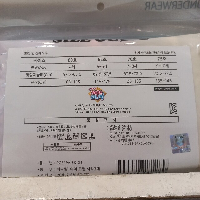 | 6. 세탁방법 및 취급시 주의사항 | 세탁라벨참조 |