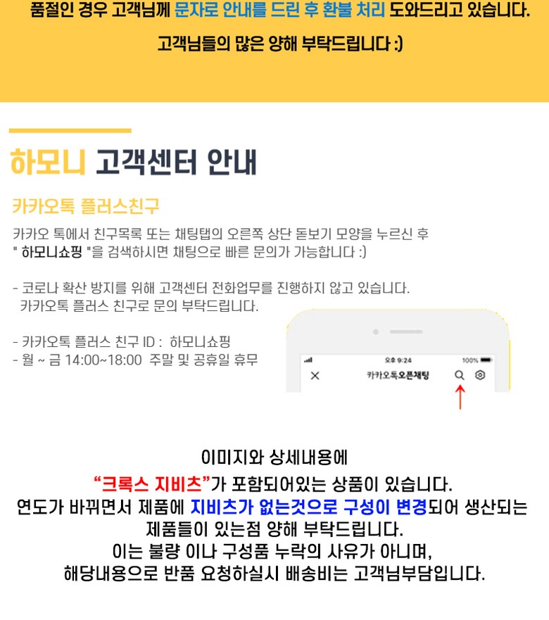 상품불량에 의한 반품, A/S, 품질보증 및 피해보상 등에 관한 사항은 소비자 분쟁해결기준(공정거래위원회 고시) 구매자가 미성년자인 경우에는 상품 구입시 법정대리인이 동의하지 아니하면 미성년자 본인 또는 법정대리인이 구매취소 할 수 있습니다. |