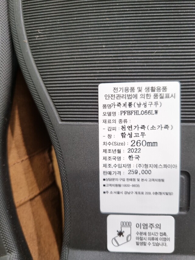 | 1. 제품 소재 (운동화인 경우에는 겉감, 안감을 구분하여 표시) | 소가죽 |