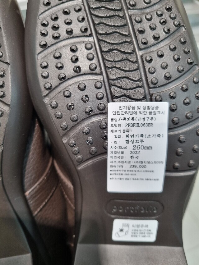 | 1. 제품 소재 (운동화인 경우에는 겉감, 안감을 구분하여 표시) | 소가죽 |