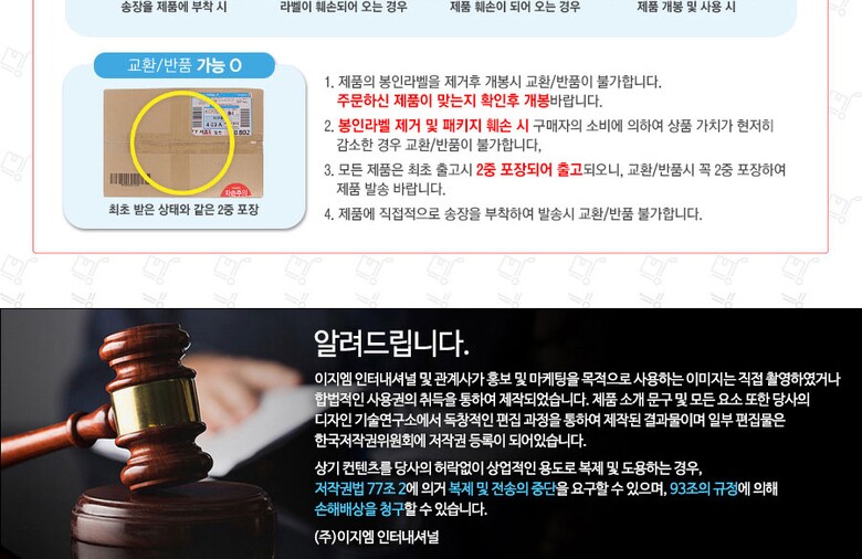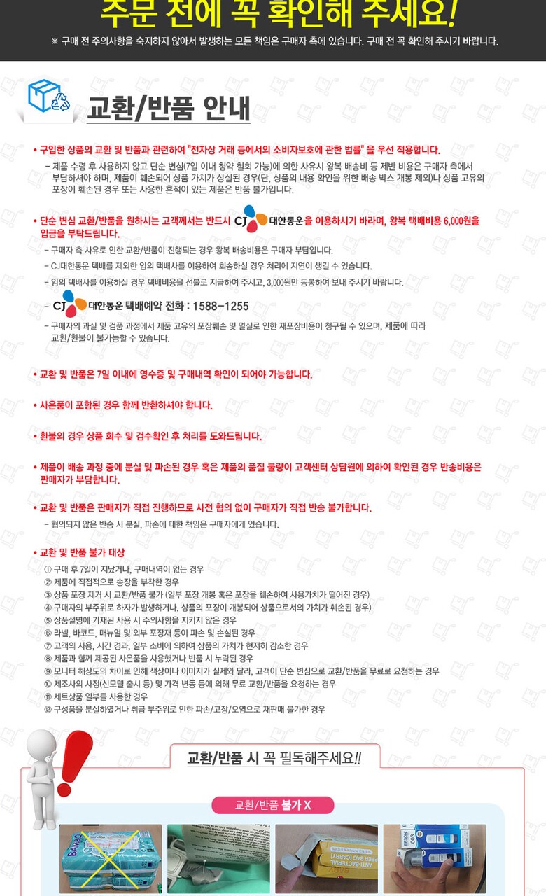 상품불량에 의한 반품, A/S, 품질보증 및 피해보상 등에 관한 사항은 소비자 분쟁해결기준(공정거래위원회 고시) 구매자가 미성년자인 경우에는 상품 구입시 법정대리인이 동의하지 아니하면 미성년자 본인 또는 법정대리인이 구매취소 할 수 있습니다. |