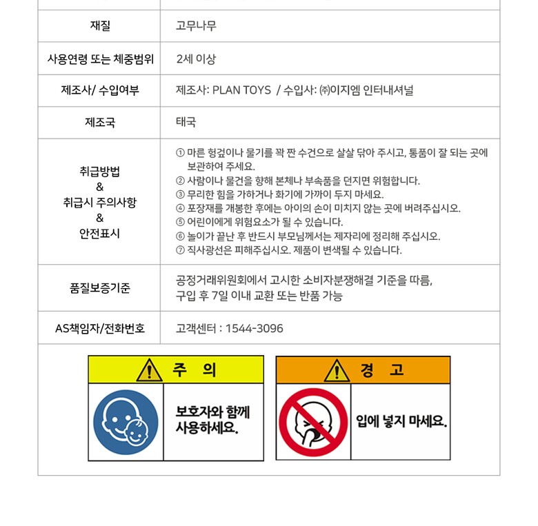 10. 취급방법 및 취급시 주의사항, 안전표시 (주의, 경고 등) | 마른 헝겊이나 물기를 꽉 짠 수건으로 살살 닦아 주시고 통풍이 잘되는 곳에 보관하여 주세요.절대로 올라 타거나 밟지 마십시오.사람이나 물건을 향해 본체나 부속품을 던지면 위험합니다.무리한 힘을 가하거나 화기에 가까이 두지 마세요. 포장재를 개봉한 후에는 아이의 손이 미치지 않는 곳에 버려주십시오. 어린이에게 위험요소가 될 수 있습니다.놀이가 끝난 후 반드시 부모님께서는 제자리에 정리해 주십시오.직사광선은 피해주십시오. 제품이 변색될 수 있습니다. |