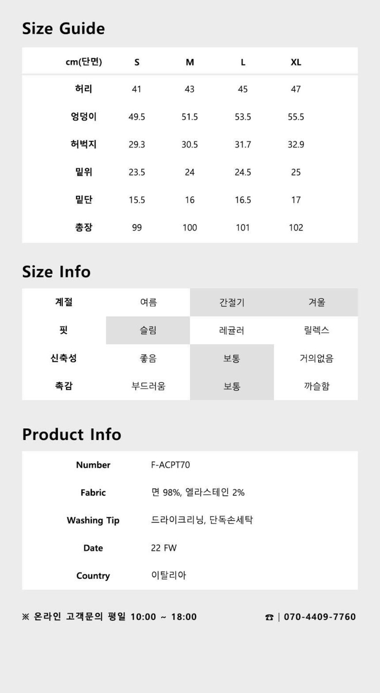 허리,힙,허벅지라인은 핏하게 맞으며 무릅밑으로부터 스트레이트하게 떨어지는 레귤러슬림라인으로 트렌디한 느낌입니다