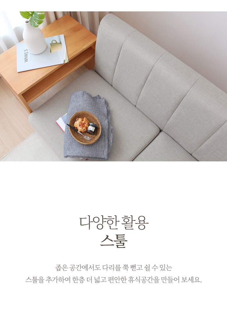 5. 주요 소재 | 소파커버:폴리에스테르, 내장재:우레탄폼, 프레임:건조목 및 철제스프링,등쿠션:마이크로화이버, 다릿발:PP |