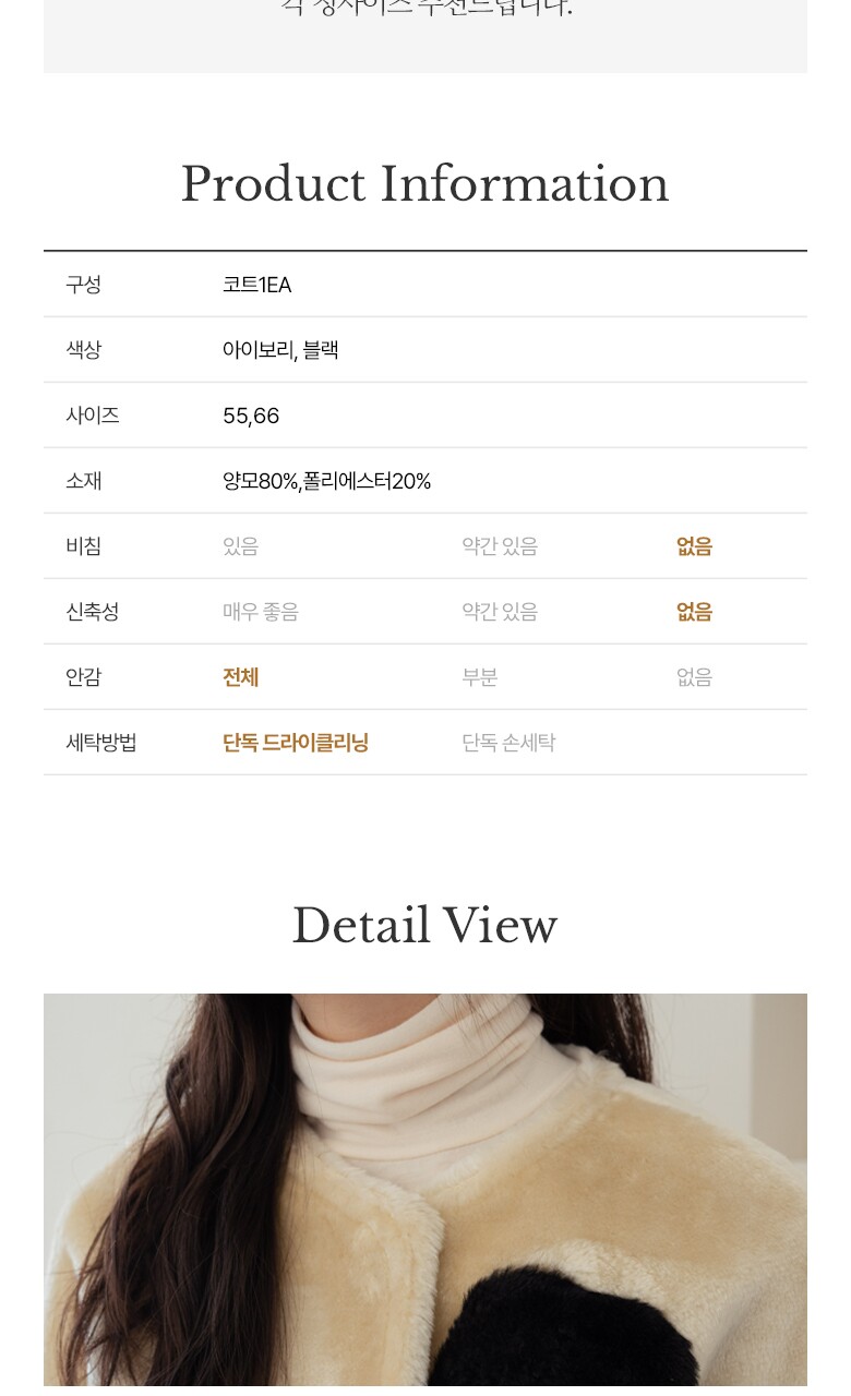 1. 제품 소재 (섬유의 조성 또는 혼용률을 백분율로 표시, 기능성인 경우 성적서 또는 허가서) | 양모80%,폴리에스터20% |