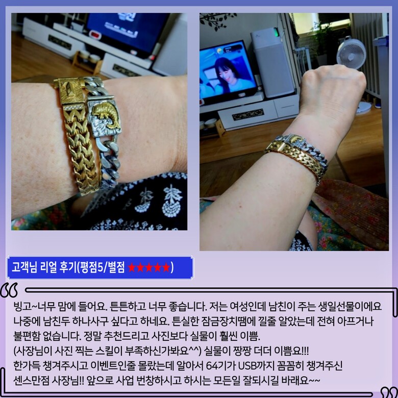 -물기는 최대한 멀리해주시고 물기가 묻으면 바로 닦아주시면 새상품처럼 오래도록 착용이 가능합니다.