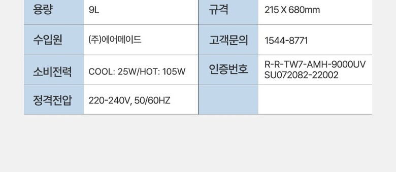 8. 제조사(수입자) | 상세페이지 참조 |