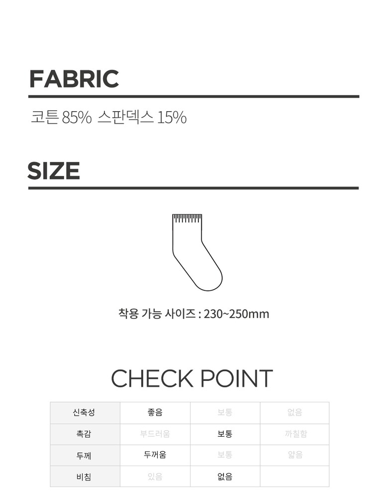1. 제품 소재 (섬유의 조성 또는 혼용률을 백분율로 표시, 기능성인 경우 성적서 또는 허가서) | 코튼85% 스판덱스15% |