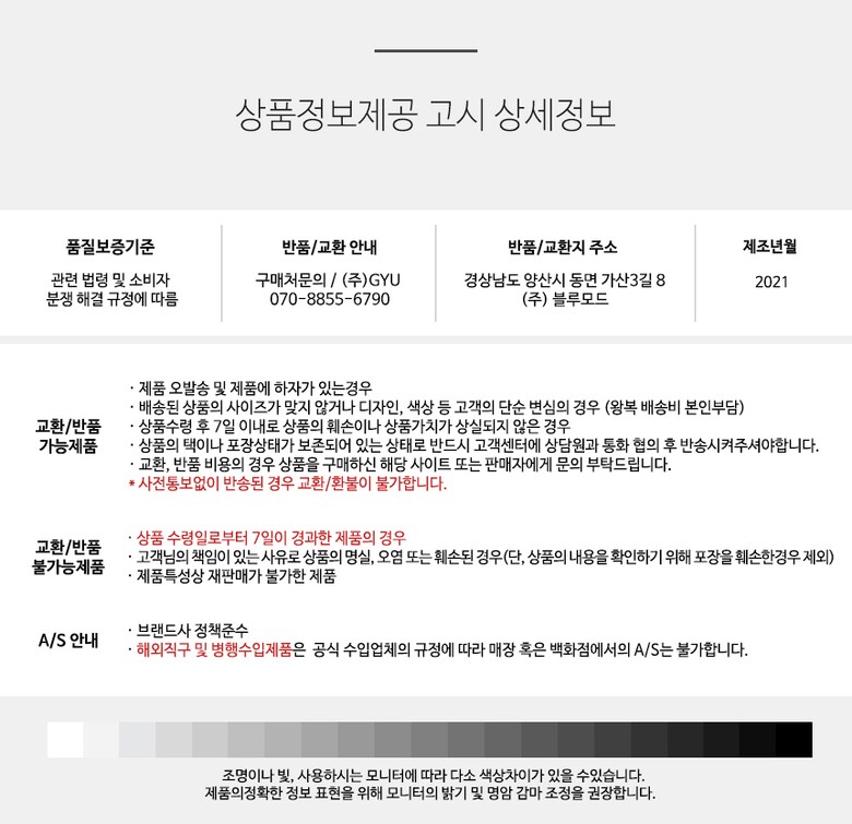 • 모든 규정은 전자상거래법에 의거하며, 택배사정으로 배송이 지연된 경우 재화를 공급받은 날로부터 7일 이내에 반품 가능합니다.