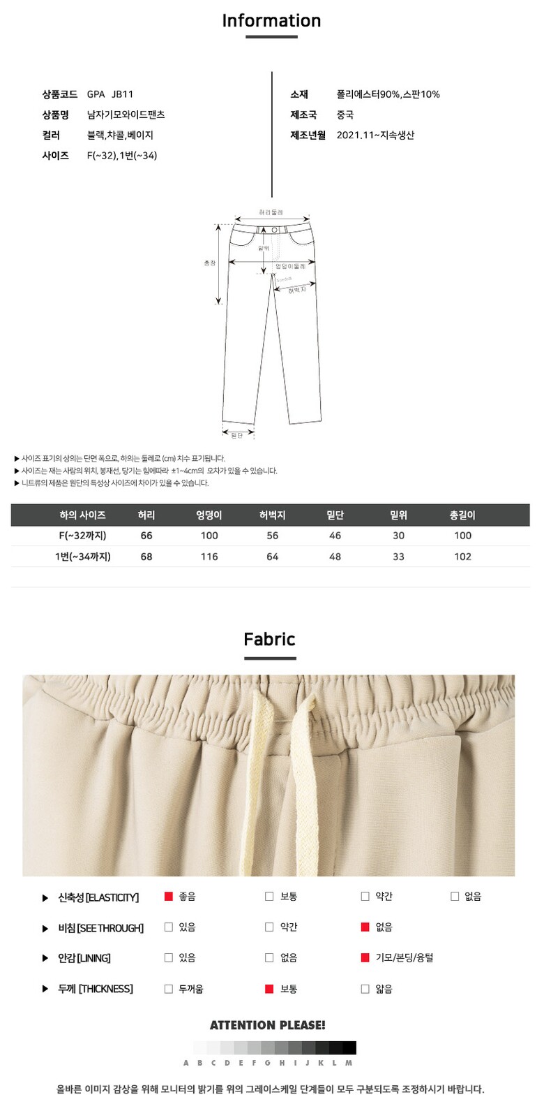 | 1. 제품 소재 (섬유의 조성 또는 혼용률을 백분율로 표시, 기능성인 경우 성적서 또는 허가서) | 상세이미지 참조 |