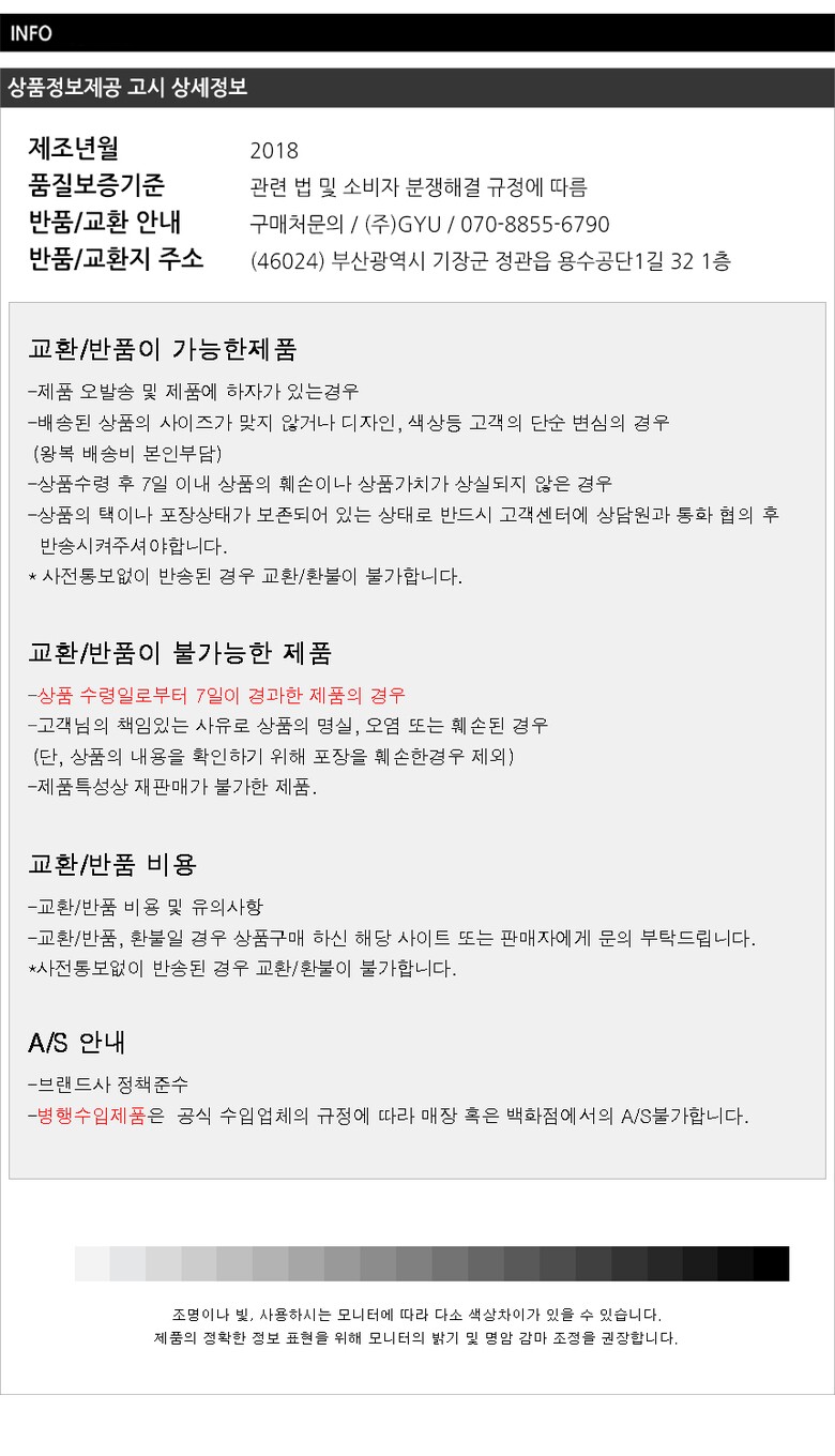 상품불량에 의한 반품, A/S, 품질보증 및 피해보상 등에 관한 사항은 소비자 분쟁해결기준(공정거래위원회 고시) 구매자가 미성년자인 경우에는 상품 구입시 법정대리인이 동의하지 아니하면 미성년자 본인 또는 법정대리인이 구매취소 할 수 있습니다. |