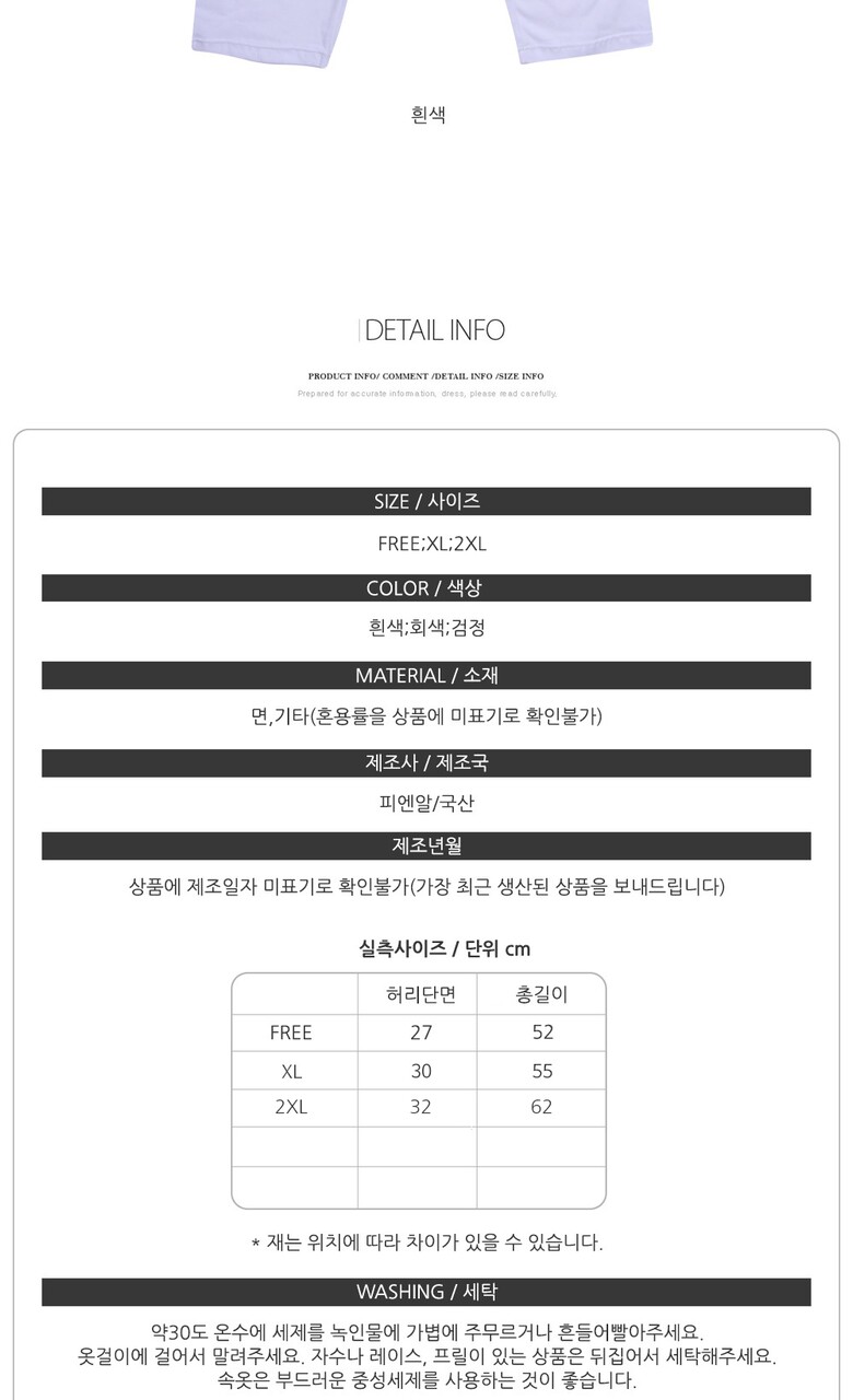 | 1. 제품 소재 (섬유의 조성 또는 혼용률을 백분율로 표시, 기능성인 경우 성적서 또는 허가서) | 면/외(상품에 혼용율 미표기로 알 수 없음) |