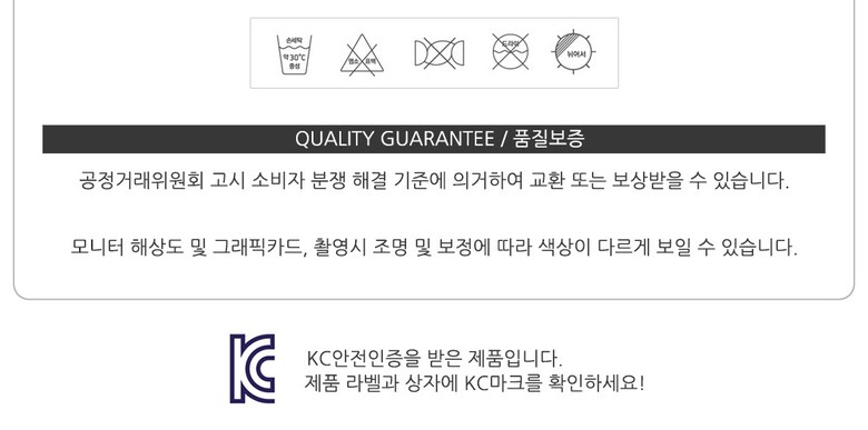 | 6. 세탁방법 및 취급시 주의사항 | 30도 온수로 중성세제를 사용하여 손세탁 및 분리세탁을 권장합니다. |
