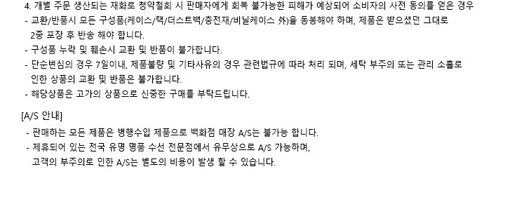• 표시/광고와 상이, 제품 하자의 경우 수령 후 3개월 이내, 또는 그 사실을 안 날로부터 30일 이내 교환/반품 가능합니다.