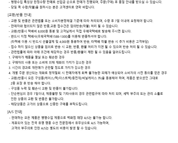 상품불량에 의한 반품, A/S, 품질보증 및 피해보상 등에 관한 사항은 소비자 분쟁해결기준(공정거래위원회 고시) 구매자가 미성년자인 경우에는 상품 구입시 법정대리인이 동의하지 아니하면 미성년자 본인 또는 법정대리인이 구매취소 할 수 있습니다. |