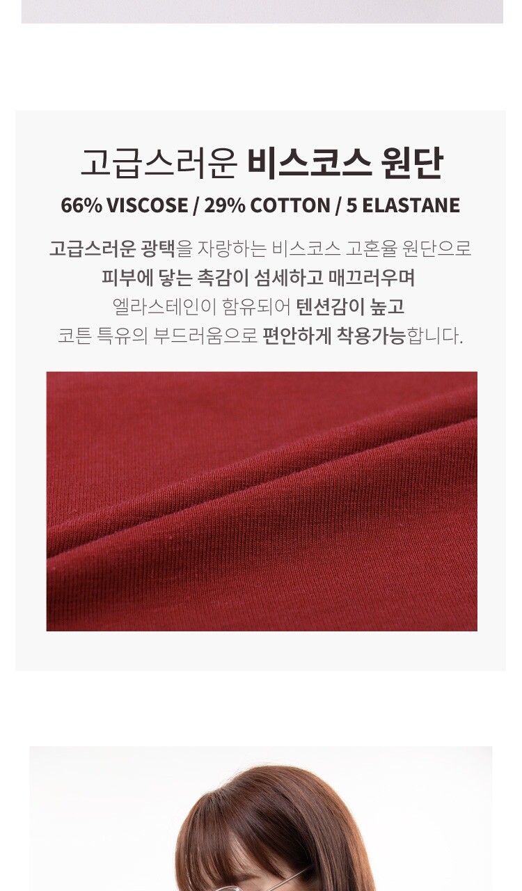 1. 제품 소재 (섬유의 조성 또는 혼용률을 백분율로 표시, 기능성인 경우 성적서 또는 허가서) | 비스코스 66% 코튼 29% 엘라스테인 5% |