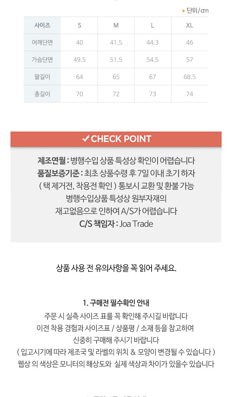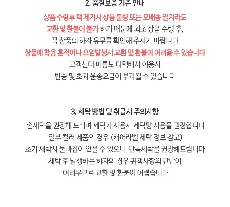 • 처음 배송된 상품상태와 다를 경우(세탁/착용 후 외출하신 경우) 반품이 불가합니다.