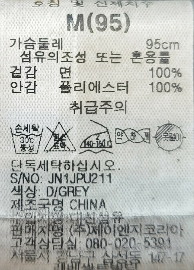 | 1. 제품 소재 (섬유의 조성 또는 혼용률을 백분율로 표시, 기능성인 경우 성적서 또는 허가서) | 면 100% / 안감:폴리에스테르 100% |