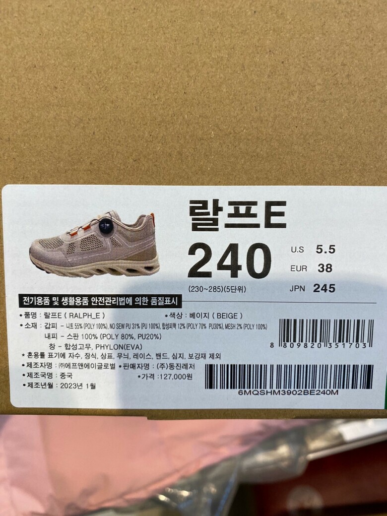 1. 제품 소재 (운동화인 경우에는 겉감, 안감을 구분하여 표시) 갑피 - 니트, 합성피혁 내피 - 폴리에스터 창 - 합성고무