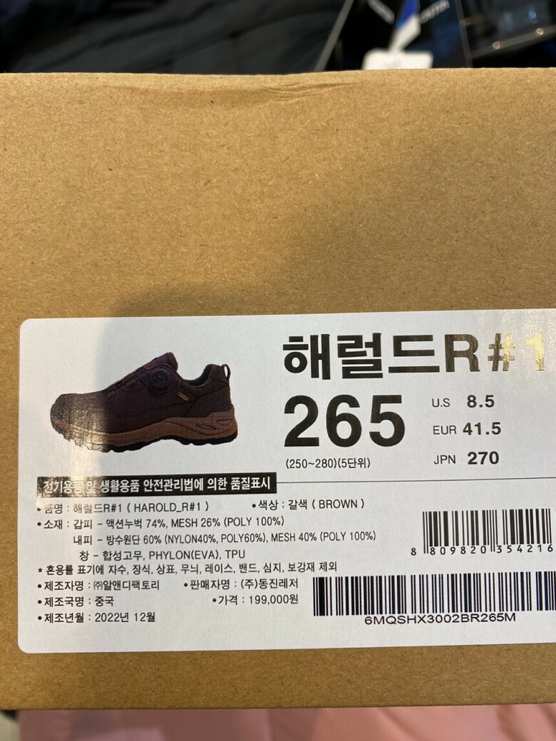 | 1. 제품 소재 (운동화인 경우에는 겉감, 안감을 구분하여 표시) | 갑피 - 액션누벅 74%, 메쉬 26% (폴리에스터 100%) 내피 - 방수원단 |