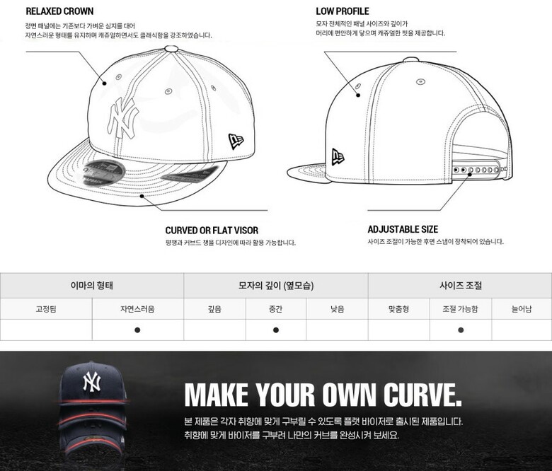 9FIFTY RETRO CROWN 이란 59FIFTY RETRO CROWN 실루엣에서 후면의 형태가 9FIFTY 스냅으로 변형된 모델입니다. 후면 스트랩이 장착되어 있어 사이즈 조절이 가능하며, 크라운은 각을 무너트려 자연스러운 형태를 유지하여 클래식함을 강조하였습니다. 모자 챙 상단에서 9FIFTY RC를 상징하는 Sticker가 부착되어 있으며, 모자의 챙은 기본적으로 Flat visor로 제작됩니다. 이는 제품의 이동 시 파손을 방지함과 동시에 개인의 취향에 따라 다양한 각도로 구부려 착용할 수 있도록 하기 위함이며, 선수의 경기력 향상과 부상 방지를 위하여 가벼운 펄프 소재의 심지로 구성되어 있습니다.