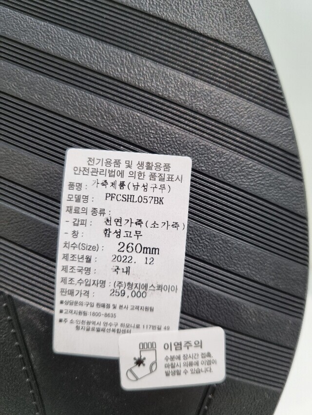 | 1. 제품 소재 (운동화인 경우에는 겉감, 안감을 구분하여 표시) | 소가죽 |