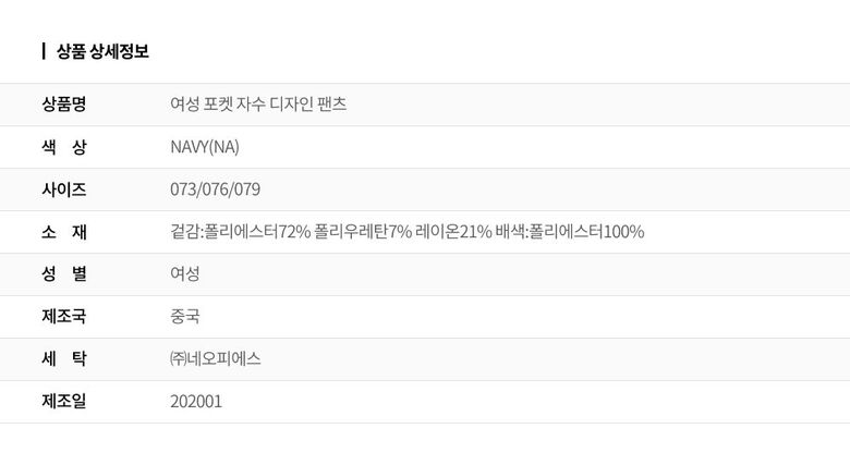 1. 제품 소재 (섬유의 조성 또는 혼용률을 백분율로 표시, 기능성인 경우 성적서 또는 허가서) 겉감:폴리에스터72% 폴리우레탄7% 레이온21% 배색:폴리에스터100%