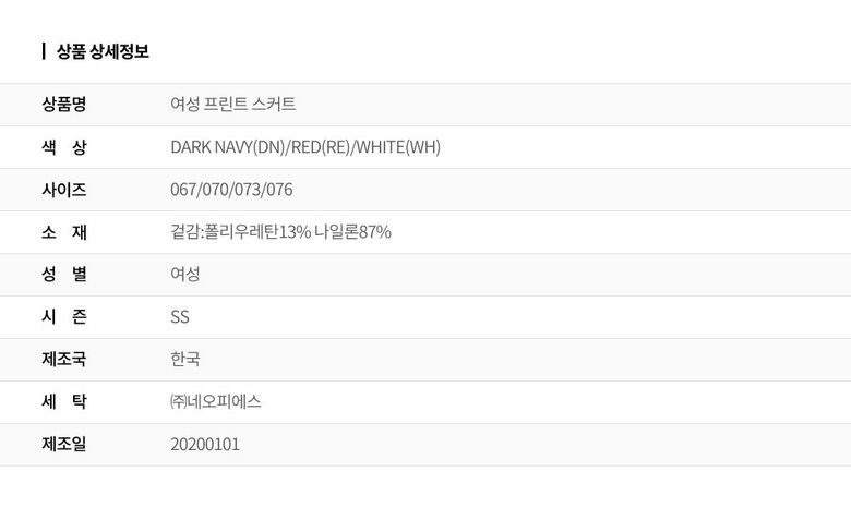 | 1. 제품 소재 (섬유의 조성 또는 혼용률을 백분율로 표시, 기능성인 경우 성적서 또는 허가서) | 겉감:폴리우레탄13% 나일론87% |