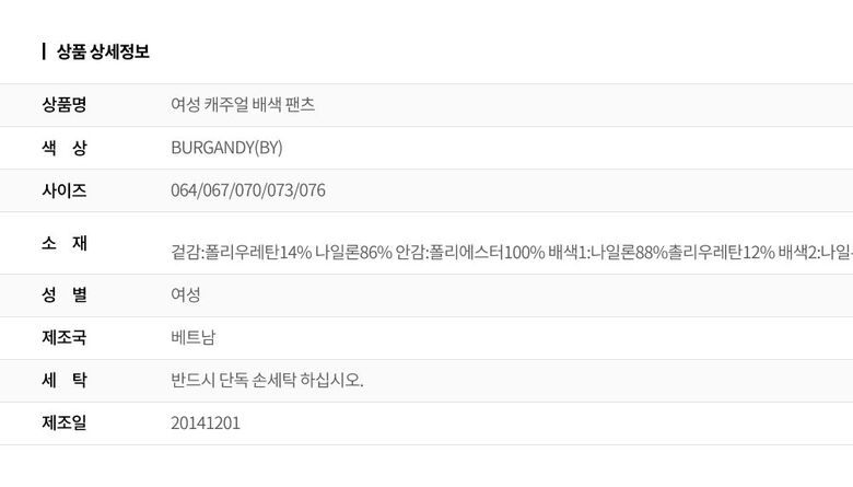 | 1. 제품 소재 (섬유의 조성 또는 혼용률을 백분율로 표시, 기능성인 경우 성적서 또는 허가서) | 겉감:폴리우레탄14% 나일론86% 안감:폴리에스터100% 배색1:나일론88%촐리우레탄12% 배색2:나일론60%폴리에스터32%폴리우레탄8% |