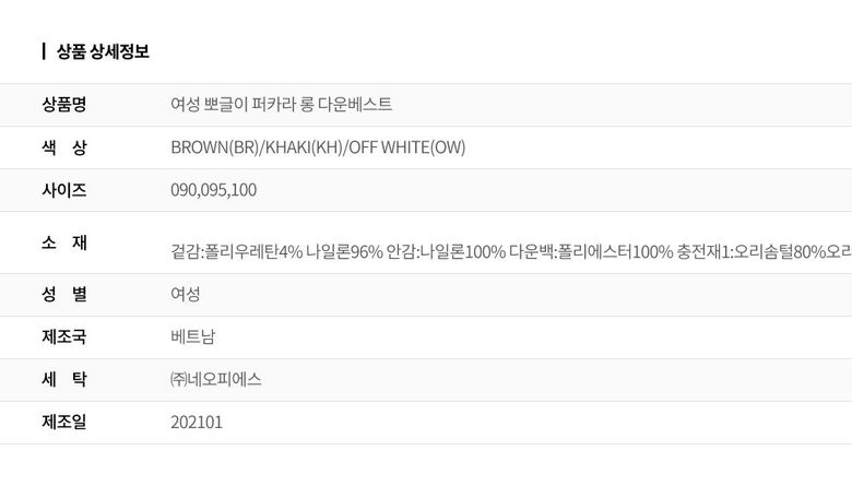 | 1. 제품 소재 (섬유의 조성 또는 혼용률을 백분율로 표시, 기능성인 경우 성적서 또는 허가서) | 겉감:폴리우레탄4% 나일론96% 안감:나일론100% 다운백:폴리에스터100% 충전재1:오리솜털80%오리깃털20% 충전재2:폴리에스터100% 배색:폴리에스터100% |