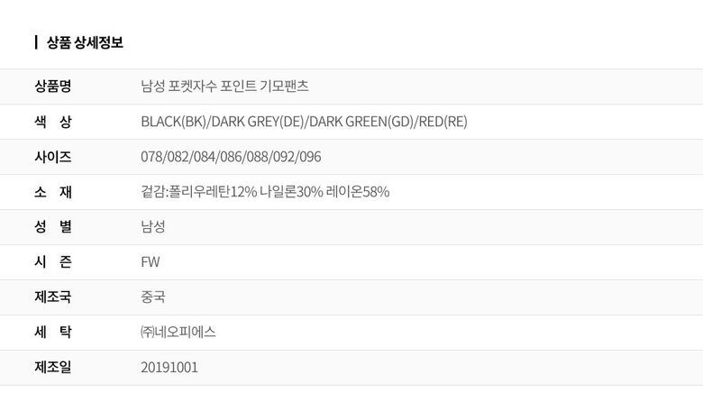 | 1. 제품 소재 (섬유의 조성 또는 혼용률을 백분율로 표시, 기능성인 경우 성적서 또는 허가서) | 겉감:폴리우레탄12% 나일론30% 레이온58% |