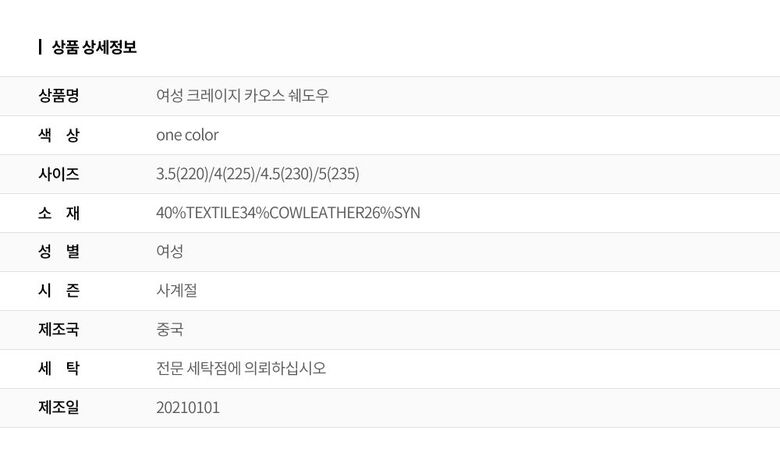 1. 제품 소재 (섬유의 조성 또는 혼용률을 백분율로 표시, 기능성인 경우 성적서 또는 허가서) | 40%TEXTILE34%COWLEATHER26%SYN |