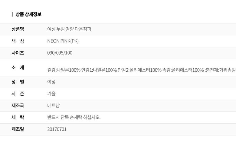 | 1. 제품 소재 (섬유의 조성 또는 혼용률을 백분율로 표시, 기능성인 경우 성적서 또는 허가서) | 겉감:나일론100% 안감1:나일론100% 안감2:폴리에스터100% 속감:폴리에스터100% :충전재:거위솜털90% 거위깃털10% |