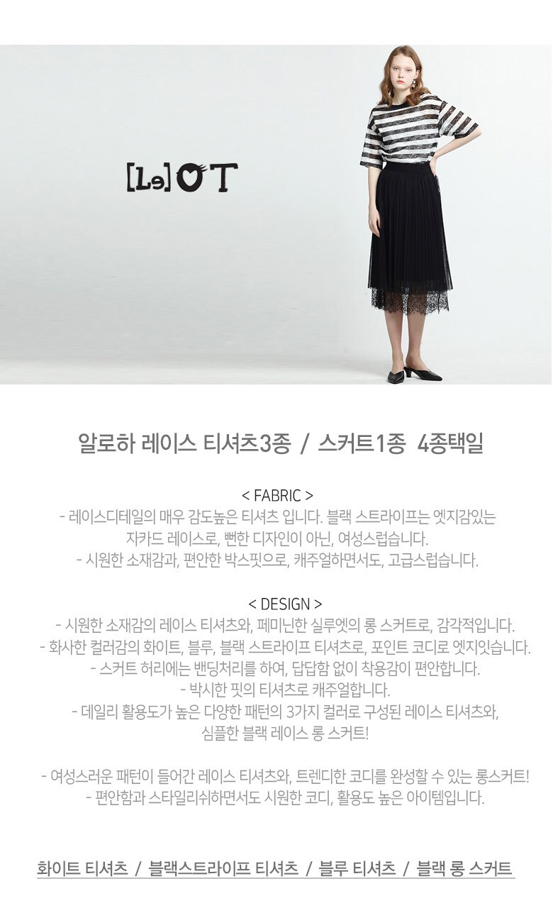 2. 색상 | 화이트 티셔츠, 블랙스트라이프 티셔츠, 블루 티셔츠, 블랙 롱 스커트 |