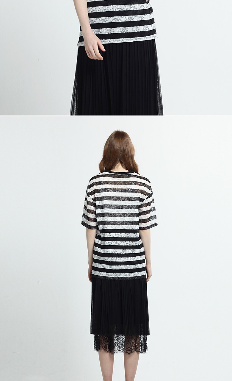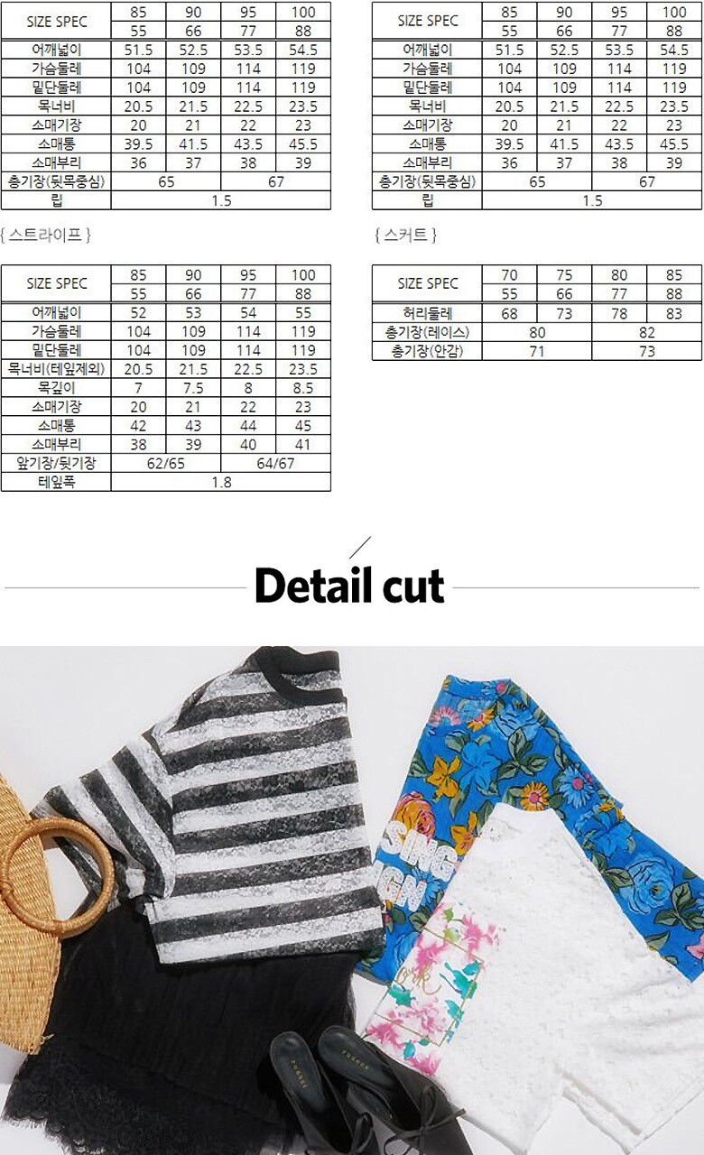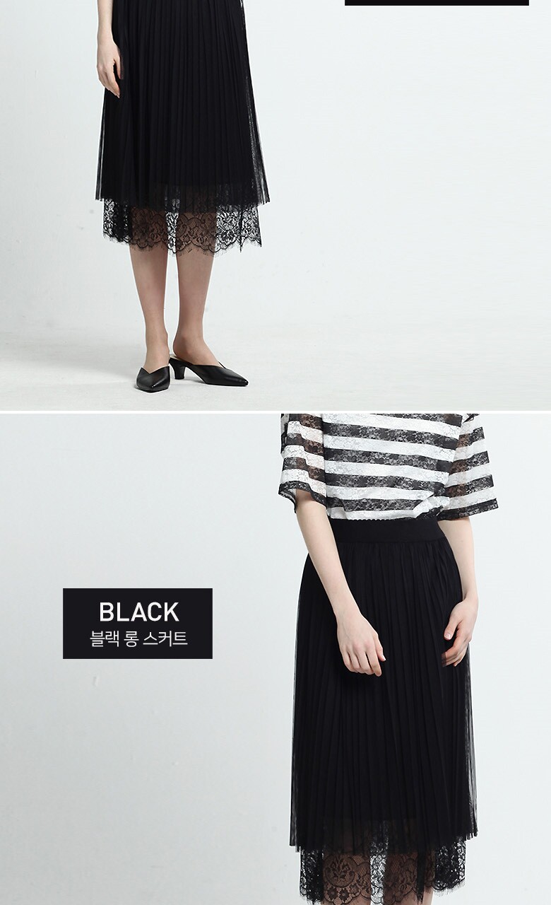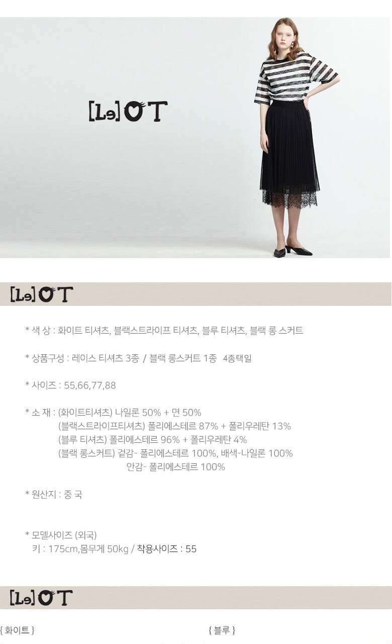 (블랙스트라이프티셔츠) 폴리에스테르 87% + 폴리우레탄 13% (블루 티셔츠) 폴리에스테르 96% + 폴리우레탄 4% (블랙 롱스커트) 겉감- 폴리에스테르 100%, 배색-나일론 100% 안감- 폴리에스테르 100% |