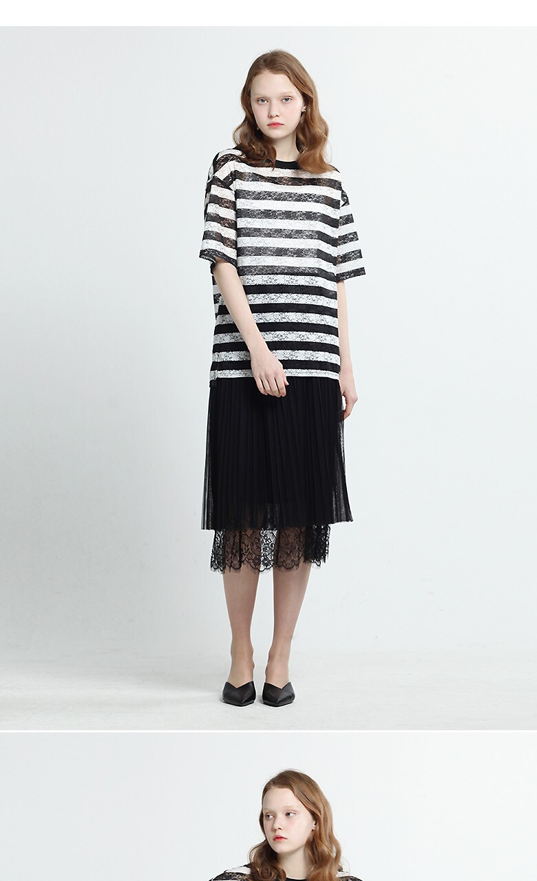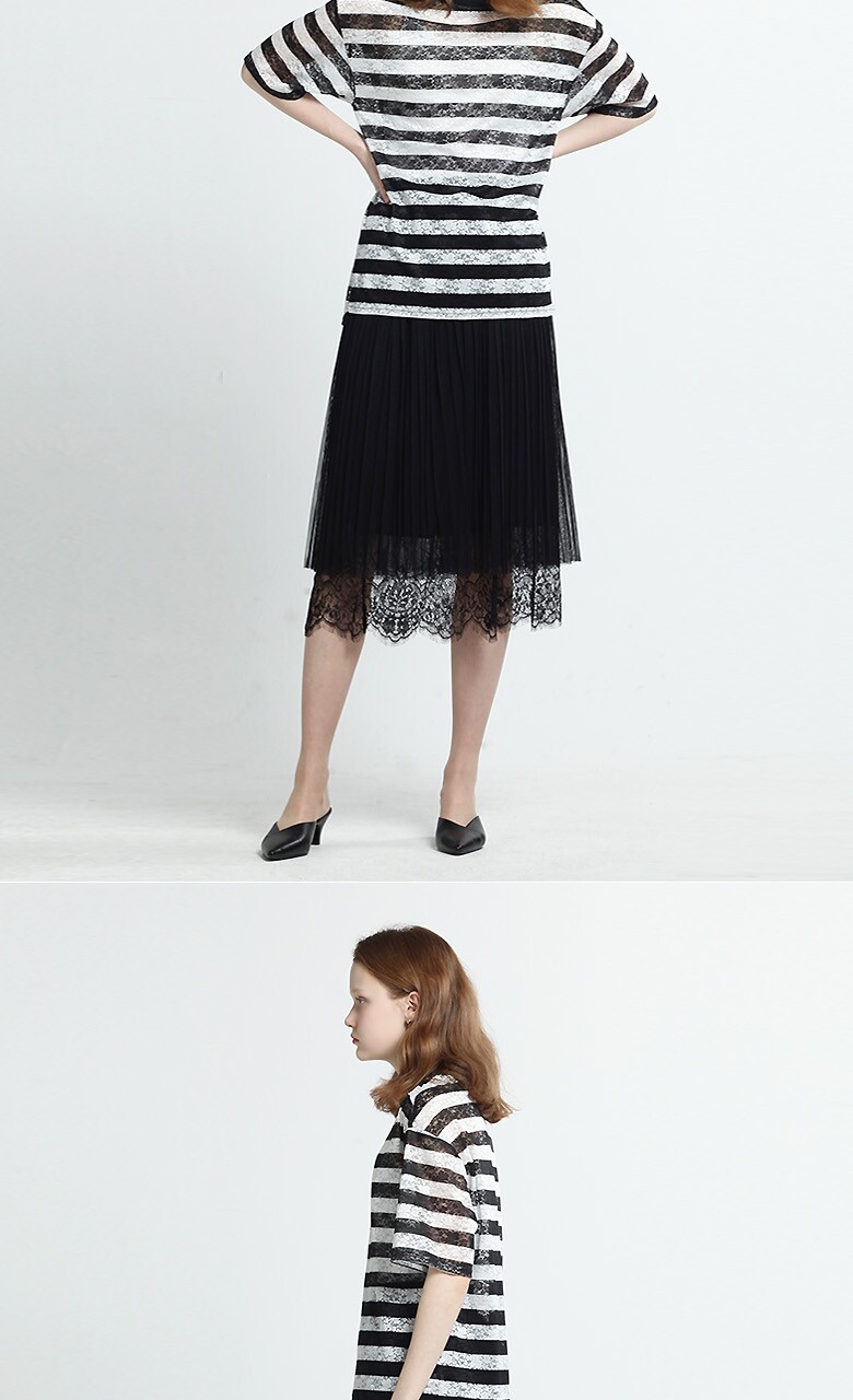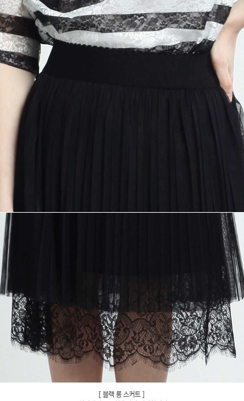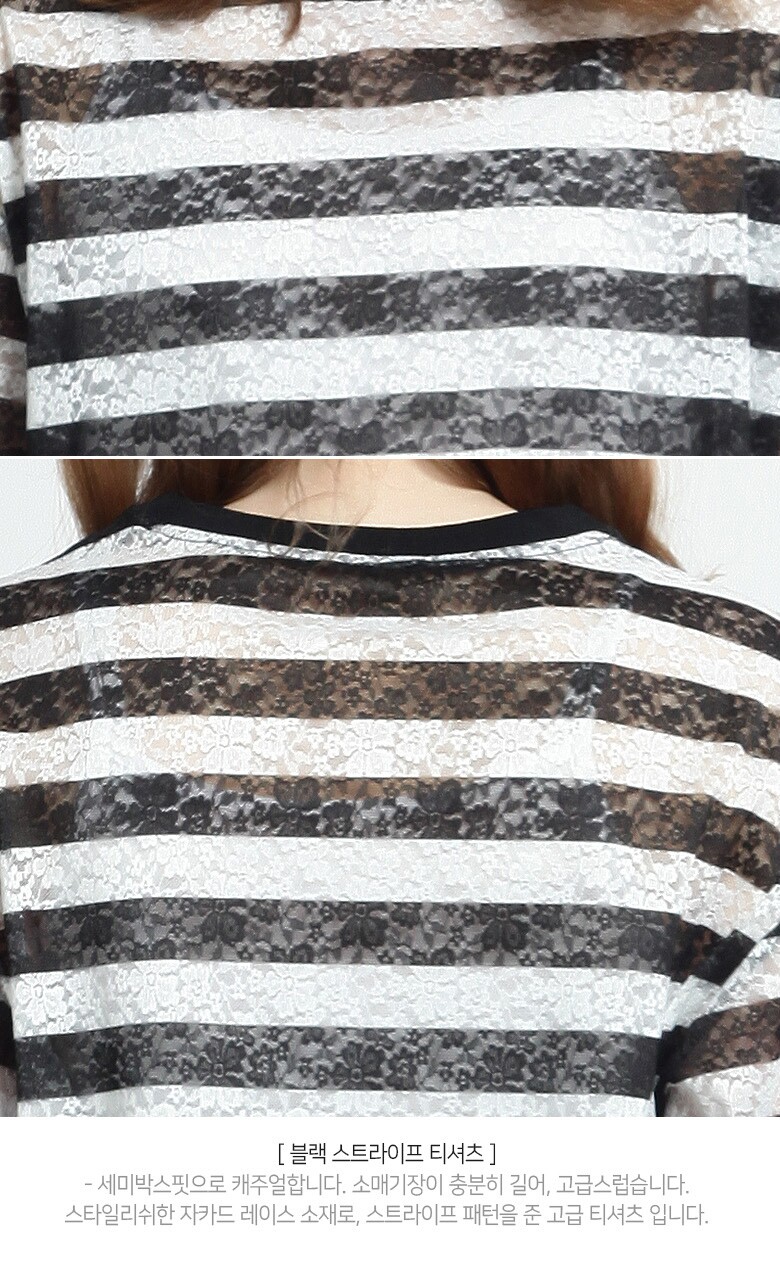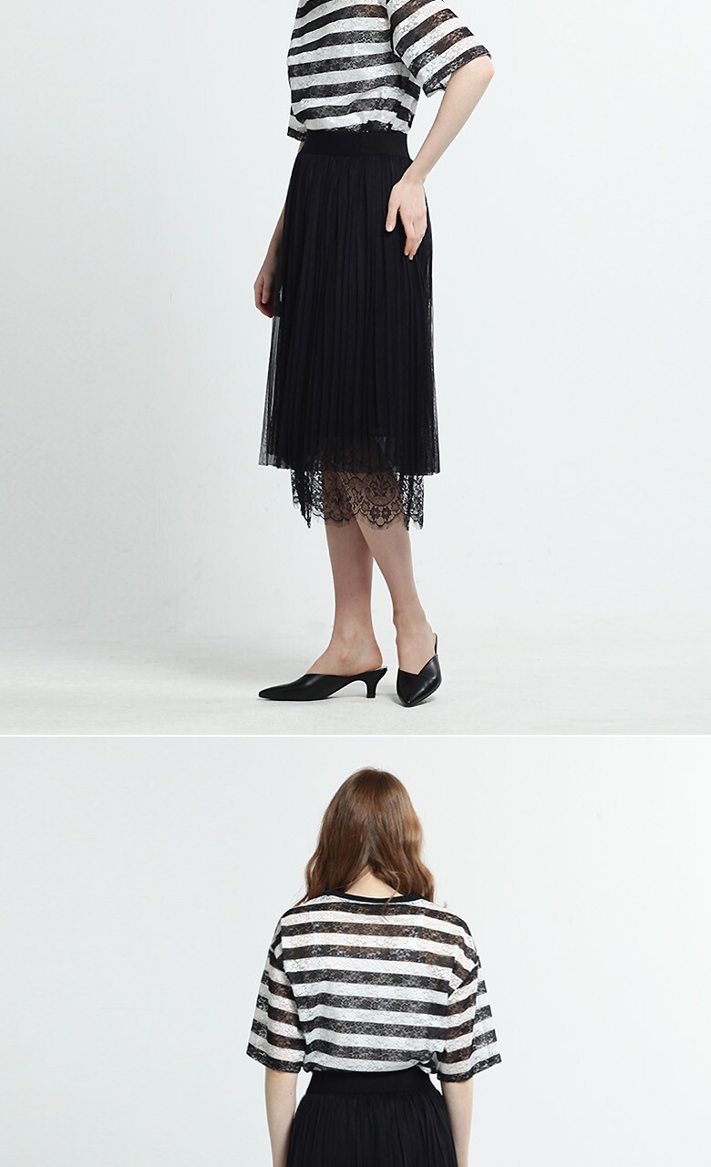 (블랙스트라이프티셔츠) 폴리에스테르 87% + 폴리우레탄 13% (블루 티셔츠) 폴리에스테르 96% + 폴리우레탄 4% (블랙 롱스커트) 겉감- 폴리에스테르 100%, 배색-나일론 100% 안감- 폴리에스테르 100% |