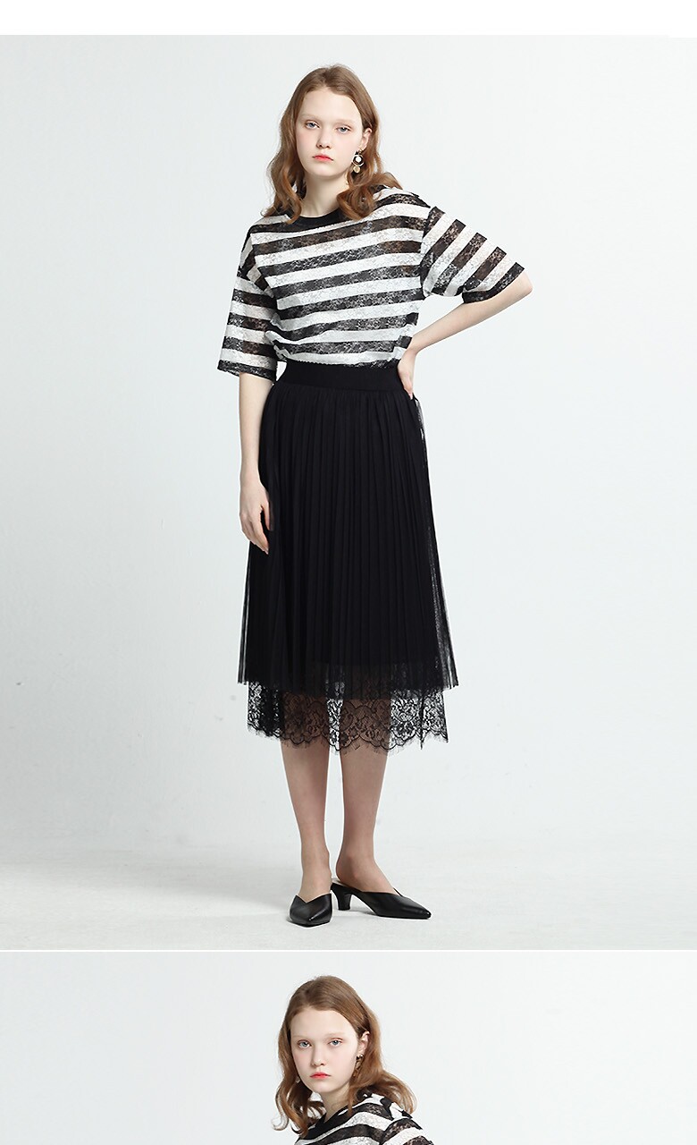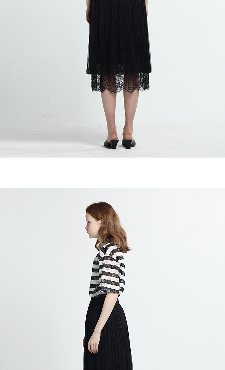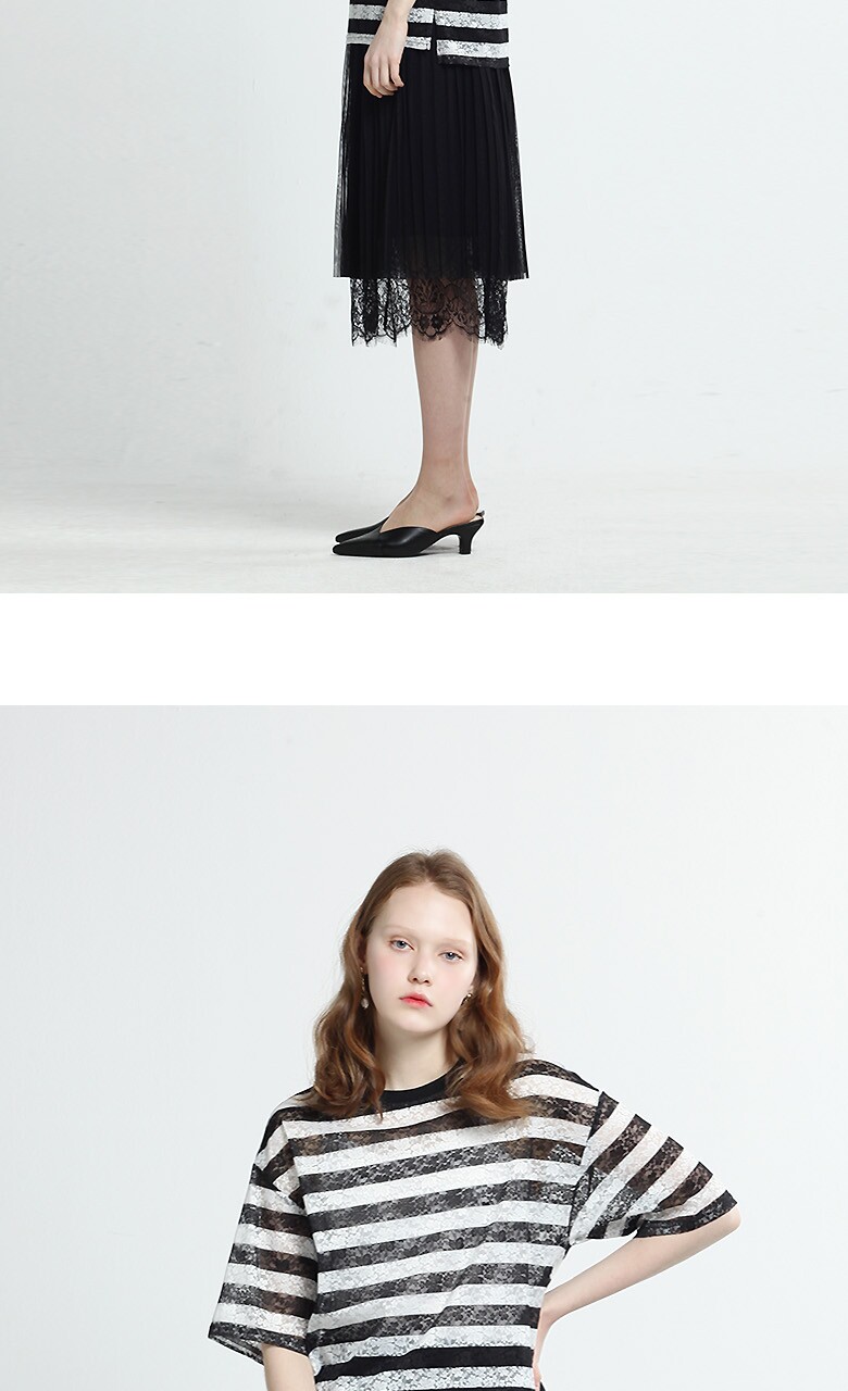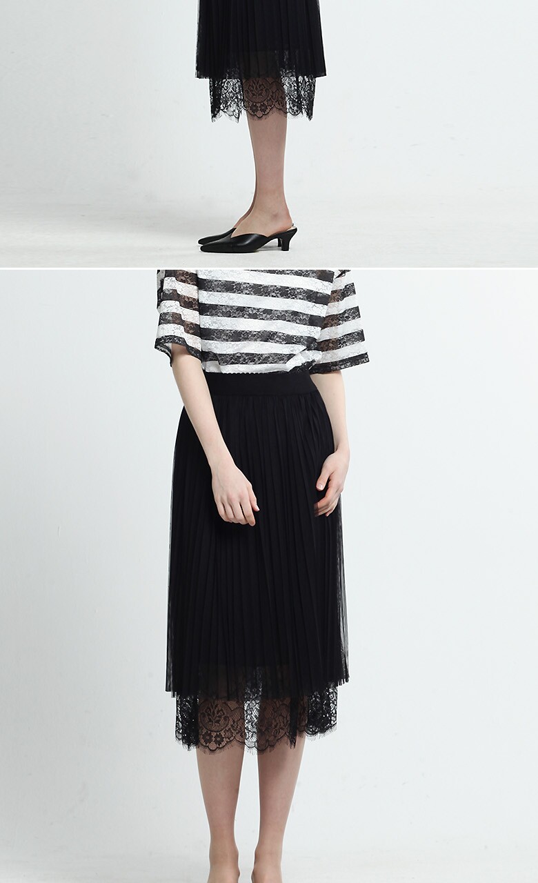 (블랙스트라이프티셔츠) 폴리에스테르 87% + 폴리우레탄 13% (블루 티셔츠) 폴리에스테르 96% + 폴리우레탄 4% (블랙 롱스커트) 겉감- 폴리에스테르 100%, 배색-나일론 100% 안감- 폴리에스테르 100% |