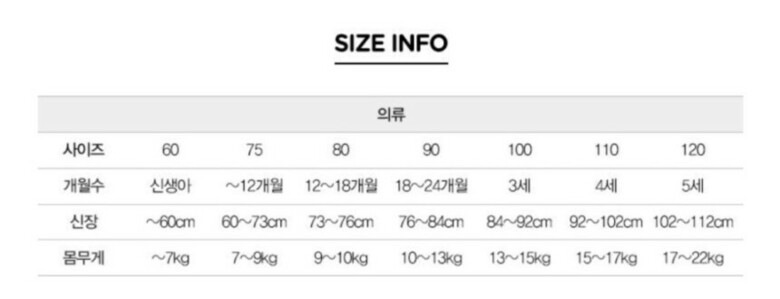 42사이즈 : 1-3개월, 44사이즈 : 3-6개월