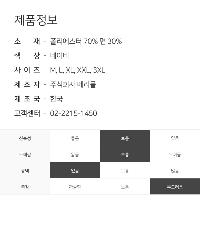 1. 제품 소재 (섬유의 조성 또는 혼용률을 백분율로 표시, 기능성인 경우 성적서 또는 허가서) | 폴리에스터 70% , 면 30% |