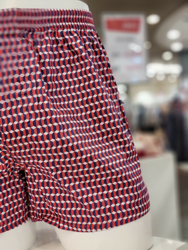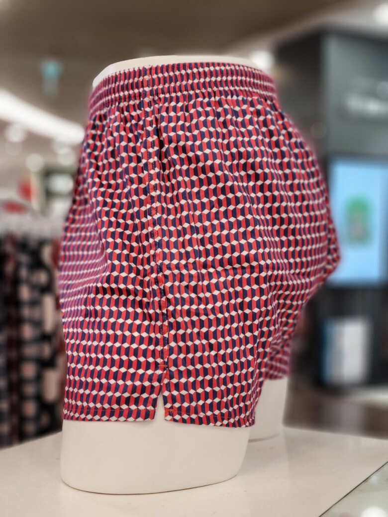 핑크 색상에 기하학 패턴이 매력적인 디자인의 남성 트렁크입니다.