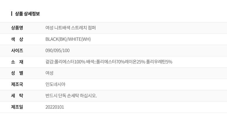 1. 제품 소재 (섬유의 조성 또는 혼용률을 백분율로 표시, 기능성인 경우 성적서 또는 허가서) 겉감:폴리에스터100% 배색::폴리에스터70%레이온25% 폴리우레탄5%
