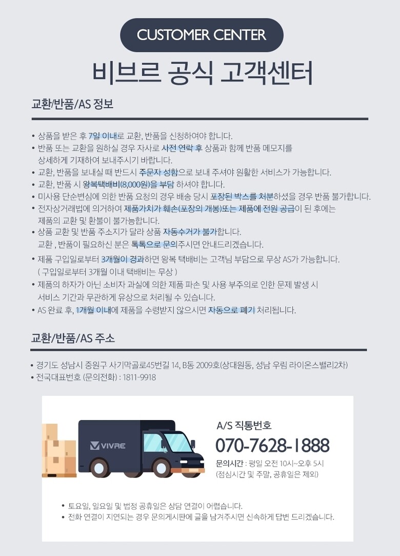 | 11. A/S책임자와전화번호 | 비브르고객센터 : 070-7628-1888 |