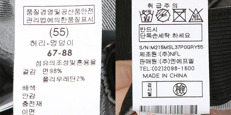 | 1. 제품 소재 (섬유의 조성 또는 혼용률을 백분율로 표시, 기능성인 경우 성적서 또는 허가서) | 겉감:면98% 폴리우레탄2% |