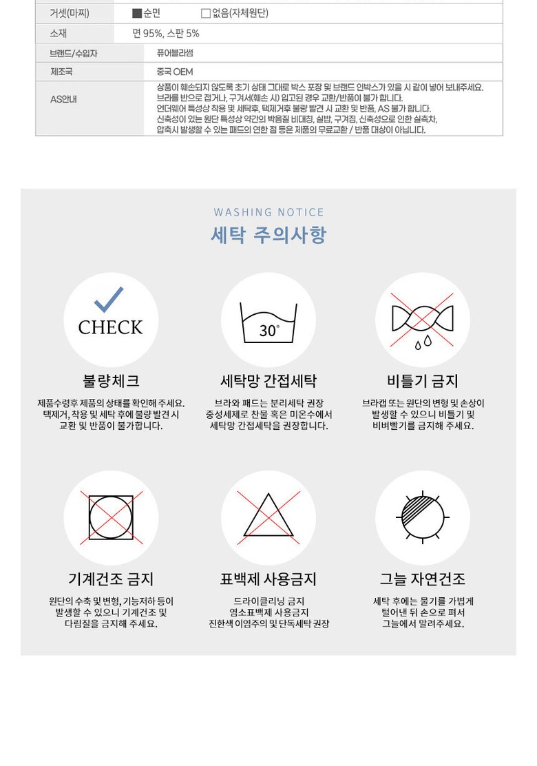 | 6. 세탁방법 및 취급시 주의사항 | 단독세탁, 표백금지, 진한색 이염주의 |