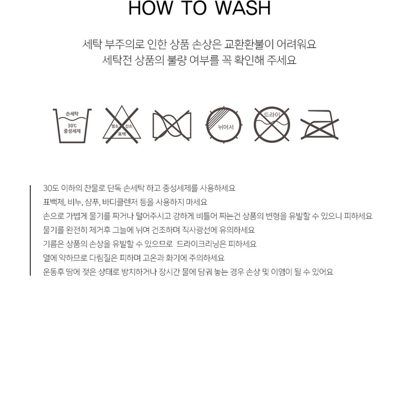 6. 세탁방법 및 취급시 주의사항 | 첫 단독 손세탁 권장, 단독세탁, 손세탁, 중성세제, 찬물세탁 |