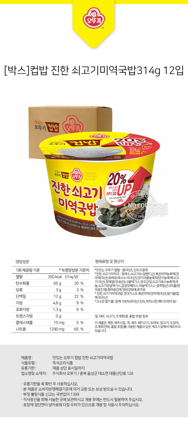 해당 상품은 [ [박스] 오뚜기 컵밥 진한 쇠고기미역국밥 314g 12입 ] 구성의 상품입니다.