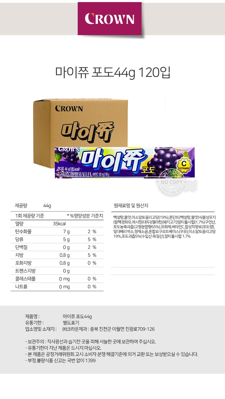 해당 상품은 [ [박스] 크라운 마이쮸 포도 44g 120입 ] 구성의 상품입니다.