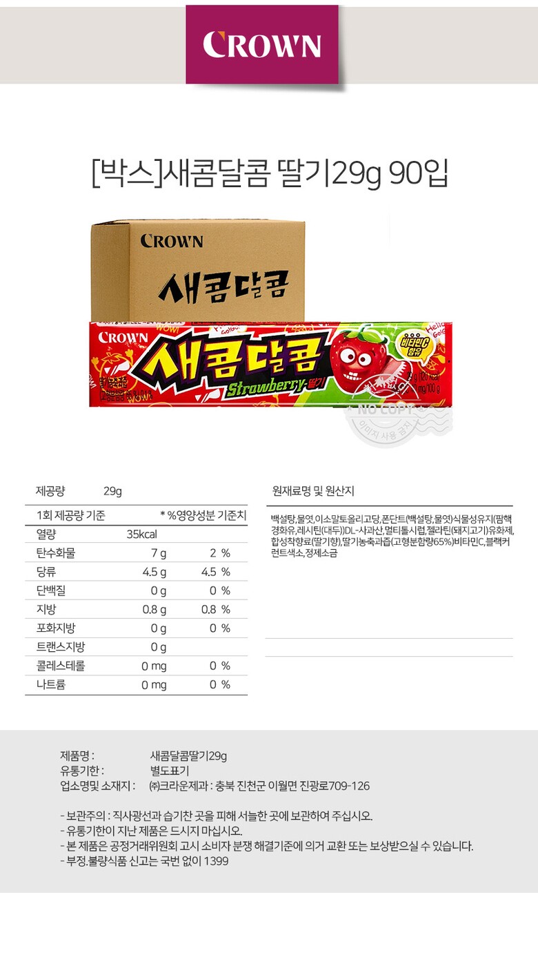 해당 상품은 [ [박스] 크라운 새콤달콤 딸기 29g 90입 ] 구성의 상품입니다.