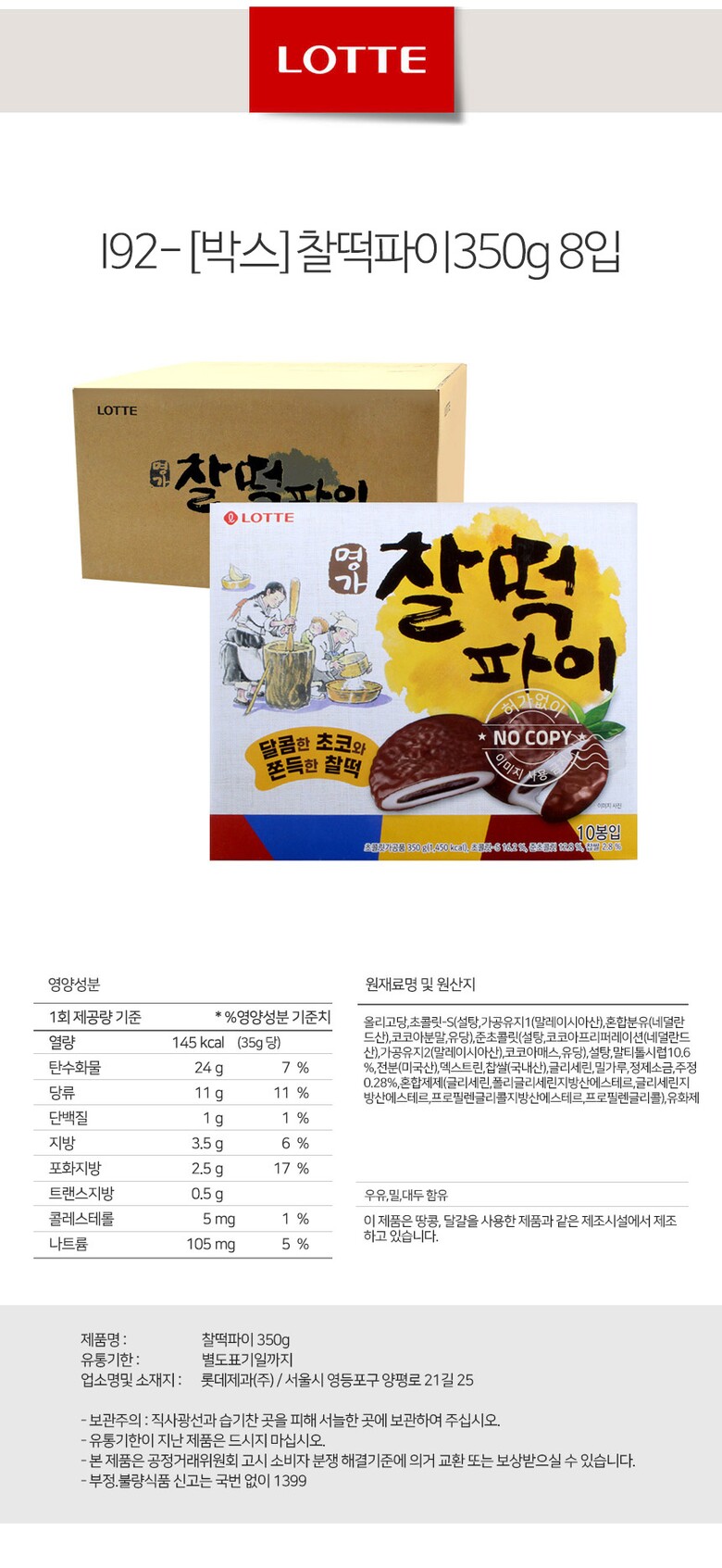 해당 상품은 [ [박스] 롯데 찰떡파이 350g 8입 ] 구성의 상품입니다.